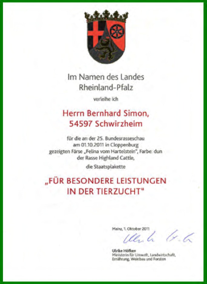 Für unsere Färse “Felina vom Hartelstein” erhielten wir anläßlich