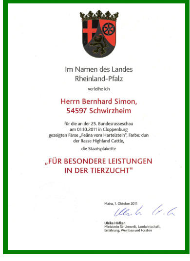 Für unsere Färse “Felina vom Hartelstein” erhielten wir anläßlichder BRS 2011 die Staatsplakette“für besondere Lestungen in der Tierzucht”